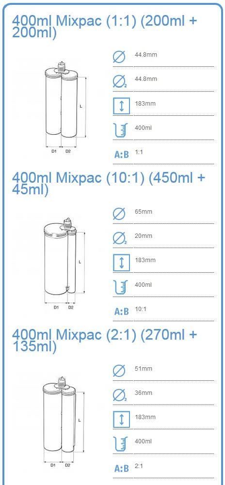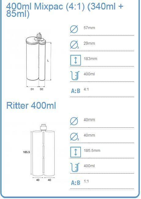 Для двухкомпонентных картриджей общим объемом 400 мл. Для картриджей с соотношением смешивания 1:1, 2:1, 4:1, 10:1 плунжеры в комплекте.